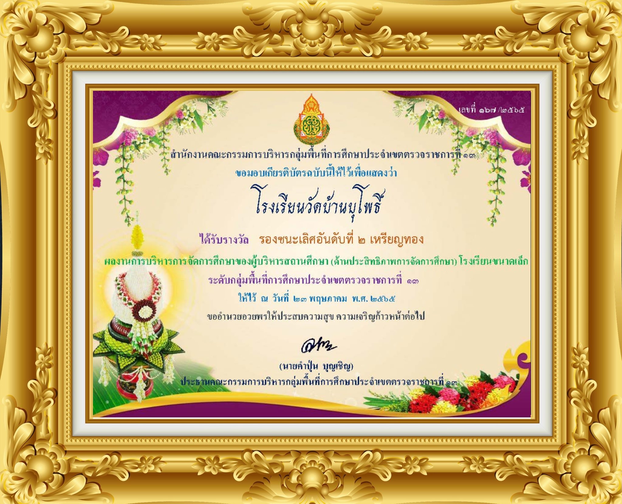 รางวัล รองชนะเลิศอันดับ 2 เหรียญทอง ผลงานการบริหารการจัดการศึกษาของผู้บริหารสถานศึกษา ด้านประสิทธิภาพการจัดการศึกษา โรงเรียนขนาดเล็ก ระดับเขตตรวจราชการที่ 13